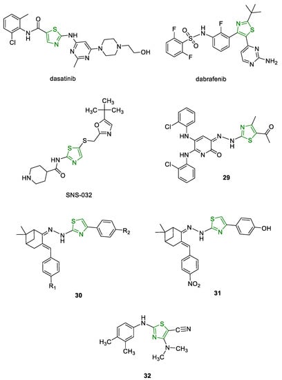 Dasatinib is approved for treatment of children and adults who are diagnosed with Philadelphia chromosome-positive chronic myeloid leukemia or Philadelphia chromosome-positive acute lymphoblastic leukemia. It is a multitarget inhibitor that inhibits BCR-ABL (breakpoint cluster region-Abelson) and other tyrosine kinases [71]. Dabrafenib is a cancer medicine used to treat adult patients with melanoma or metastatic non-small cell lung cancer with BRAF V600E mutation. The mechanism of action consists of the inhibition of BRAF kinase activity involved in stimulating cell division [72,73]. Moreover, a potent and selective inhibitor of cyclin-dependent kinases Cdk2, Cdk7, and Cdk9, the thiazole derivative SNS-032 is in phase I clinical trials [66].