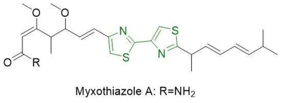 - Ahn, J.-W.; Jang, K.H.; Yang, H.-C.; Oh, K.-B.; Lee, H.-S.; Shin, J. Bithiazole Metabolites from the Myxobacterium Myxococcus fulvus. Chem. Pharm. Bull. (Tokyo) 2007, 55, 477–479. [Google Scholar] [CrossRef] [PubMed]
