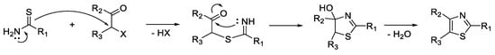 By the reaction of thiourea with alpha-halocarbonyl compounds, monosubstituted or disubstituted 2-aminothiazoles can be obtained, while by using other compounds containing thioamide moieties, such as thiosemicarbazides and thiosemicarbazones, 2-hydrazinothiazole and thiazol-2-yl-hydrazone derivatives can be synthesized in good yields. The condensation reactions occur through imino thioether and hydroxythiazoline intermediates, which are sometimes stable and isolable. The alpha-halocarbonyl component may be represented by alpha-haloketones and alpha-haloesters [32,33].