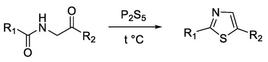 Another method of obtaining thiazoles is represented by Gabriel synthesis, which consists of the cyclization reaction of acylaminocarbonyl compounds and a stoichiometric amount of phosphorus pentasulfide at 170 °C (Scheme 2) [28,34].