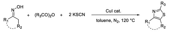 Tang et al. [37] developed a method of obtaining thiazoles by a copper-catalyzed cyclization reaction starting from oximes, anhydrides, and potassium thiocyanate (Scheme 9). To optimize reaction conditions, the authors examined various solvents, such as 1,2-dichloroethane, 1,4-dioxane, acetonitrile and toluene, different copper salts (such as CuI, CuCl, CuBr, CuBr2, Cu(OAc)2, and Cu(OTf)2 and their replacement with other metal salts such as Fe(OAc)2, FeBr2, FeBr3, FeCl3, PdCl2, and AgCl), and different sulfur sources such as KSCN, NaSCN, NH4SCN, S, and Na2S.