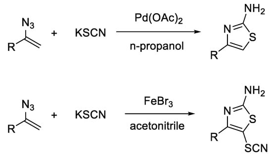 Chen et al. [39] successfully synthesized 4-substituted 2-aminothiazoles and 4-substituted 5-thiocyano-2-aminothiazoles starting from substituted vinyl azides and potassium thiocyanate under different reaction conditions. They found that the use of palladium(II) acetate as a catalyst and n-propanol as a solvent led to 4-substituted 2-aminothiazoles, after a reaction time of 12 h, at 80 °C, while in the presence of iron(III) bromide as a catalyst and acetonitrile as a solvent, 4-substituted 5-thiocyano-2-aminothiazoles were formed (Scheme 11).
