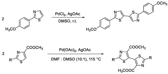 - Li, Z.; Wang, Y.; Huang, Y.; Tang, C.; Xu, J.; Wu, X.; Yao, H. Efficient palladium(II)-catalyzed homocoupling of thiazole-4-carboxylic or oxazole-4-carboxylic derivatives. Tetrahedron 2011, 67, 5550–5555. [Google Scholar] [CrossRef]