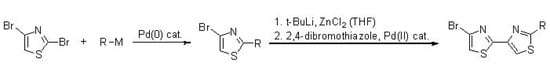 - Stanetty, P.; Schnürch, M.; Mihovilovic, M.D. Halogenated 2‘-Chlorobithiazoles via Pd-Catalyzed Cross-Coupling Reactions. J. Org. Chem. 2006, 71, 3754–3761. [Google Scholar] [CrossRef] [PubMed]