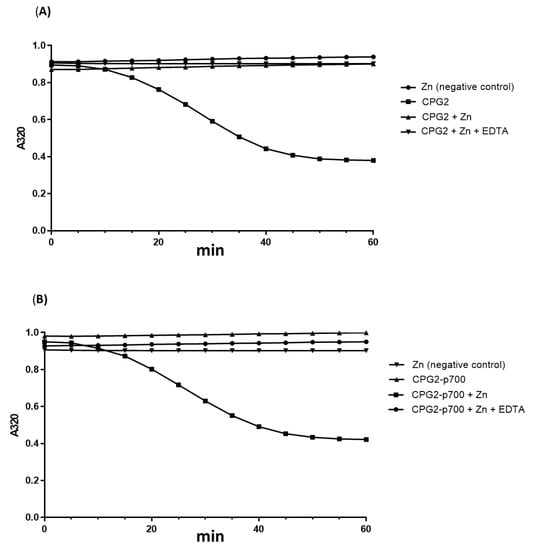 Zinc-dependence of the purified recombinant CPG2 fusion proteins for enzyme activity was evaluated as described above in the presence of ZnSO4 or in its absence with the addition of 10 mM EDTA as a zinc chelating agent.