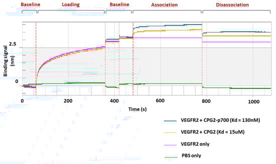 Biolayer interferometry (BLI), using the BLItz® system (ForteBio, Göttingen, Germany), was used for real-time kinetic analysis of the interaction between recombinant CPG-p700 and its ligand, VEGFR2, according to the manufacturer’s instructions.