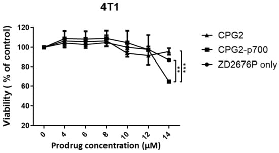 4T1 cells were seeded into three 96-well plates at a density of 2 × 103 cells per well and then cultured overnight at 37 °C. Three 96-well plates were prepared, one with 100 µL medium containing recombinant codon-optimised CPG2-only protein at 16 µg/mL maximal enzyme activity concentration, a second containing recombinant CPG2-p700 at the same concentration (16 µg/mL) and a third with 100 µL fresh medium only. The plates were incubated for 4 h at 37 °C to allow binding of the CPG2-p700. The media in all wells were then aspirated completely and the cells washed twice with PBS to remove any unbound CPG2 residues.