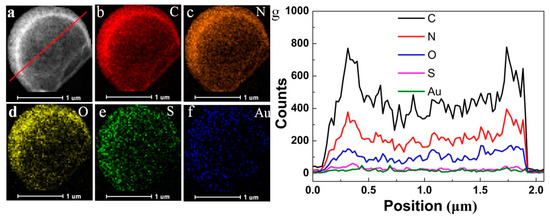 Moreover, the generated HPs were also confirmed by scanning electron microscopy (SEM) (Figure 1e,f), which clearly demonstrated the formed hollow structure and high stability under the environment of vacuum. The high-resolution transmission electron microscopy (HRTEM) image (Figure 2a) indicated clearly that the shell of HPs consisted of a flexible ultrathin membrane that was structurally robust even when dried under vacuum. Meanwhile, proteinosomes, polymersomes, and liposomes (Table S1) could not keep its stereochemical structure under vacuum, also indicating that the generated HPs showed great potential in the field of preserve in severe conditions. Also, the corresponding elemental mapping analysis and line profile in the HRTEM image (Figure 2 b–g) also demonstrated the homogeneous distribution of C, N, O and S, as well as the homogeneous distribution of Au (the characteristic elements in gold clusters) in the membrane of the HPs.