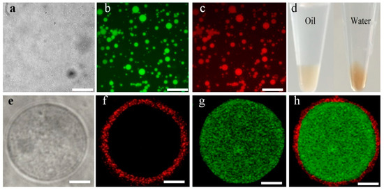 Optical microscope image of original HPs in water phase (a), fluorescence microscope images of HPs in water/oil solution, showing green (b) and red fluorescence (c) derived from encapsulating fluoresce in isothiocyanate labeled dextran (FITC-Dextran MW 500 kDa) and Au NCs, respectively, and the HPs in oil and aqueous phase (d). (e) Confocal microscopy images showing an HP incorporating Au NCs (red, f), FITC-dextran (MW 500 kDa, green, (g) and the overlapping image (h) of (f,g) in the shell and core of the HP. Scale bars in (a–c) are 100 μm, (a–d) are 5 μm, respectively.