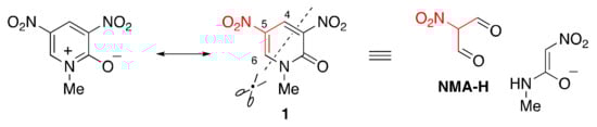 To cause the nucleophilic-type ring transformation, a substrate requires three conditions: (1) high electron deficiency, (2) low aromatic stabilizing energy, and (3) the presence of a good leaving group as the partial structure. Based on these considerations, 1-methyl-3,5-dinitro-2-pyridone (1) appears to be a suitable structure for this purpose (Figure 1). The electron-withdrawing nitro and carbonyl groups, besides the ring nitrogen atoms, diminish the electron density of this compound. As shown in the resonance form, though pyridone 1 exhibits aromaticity, it is easily destroyed because of the minimal contribution of the betaine resonance structure. In addition, the partial structure can be easily eliminated as a stable anion of nitroacetamide. When the ring transformation proceeds at the 4- and 6-positions accompanied by elimination of anionic nitroacetamide, the C4–C5–C6 moiety of pyridone 1 serves as the synthetic equivalent of nitromalonaldehyde (NMA-H). NMA-H is typically considered a synthon in retrosynthesis. However, NMA-H is too unstable to be isolated. Instead, its sodium salt (NMA-Na) has been widely used, although it should be handled carefully because of the explosive impurities [14]. Thus, it is necessary to develop a safe synthetic equivalent of NMA-H [15]. From this perspective, a nucleophilic-type ring transformation using pyridone 1 is a useful synthetic method for versatile nitro compounds because of its higher safety.