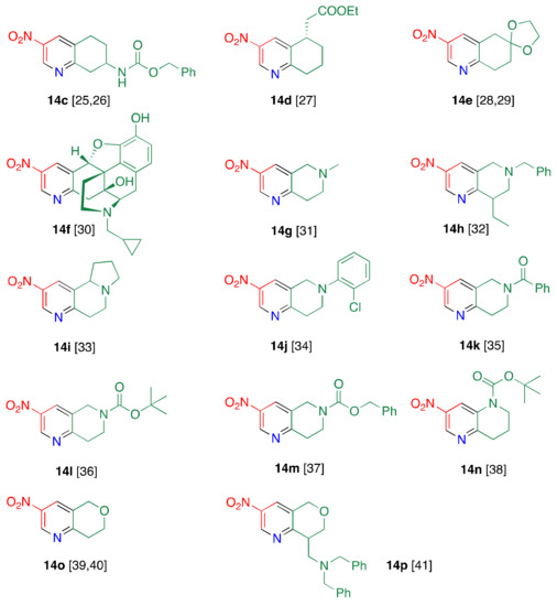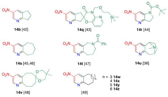 Furthermore, cyclohepta[b]pyridine 14s can be synthesized upon treatment of pyridone 1 with cycloheptanone 13s [45,46]. When aza-containing cycloheptanone 13t and bridged cycloheptanone 13u are employed, cycloheptapyridine 14t [47] and tricyclic pyridines 14u [36] are formed. Nitropyridines condensed with a larger ring (from eight to eleven membered rings) can be prepared by only altering cycloalkanones [48,49].