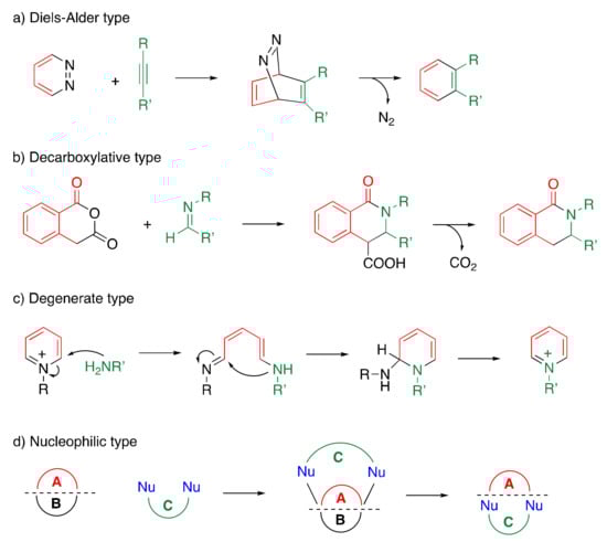 There are four types of ring transformations, namely, Diels–Alder-type, decarboxylative, degenerate, and nucleophilic-type ring transformations (Scheme 2). The most commonly used methods are Diels–Alder-type ring transformation (type a) [1,2,3] and decarboxylative ring transformation (type b) [4,5,6], wherein the substrates have a good leaving group as a partial structure (molecular nitrogen and carbon dioxide, respectively). Degenerated ring transformation was energetically studied by van der Plas [7]. This reaction proceeds through the addition of nucleophile–ring opening–ring closure (ANRORC) mechanism. The nucleophilic-type ring transformation has not been studied extensively as compared to the other three ring transformations [8,9,10,11,12,13].