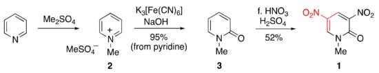 Dinitropyridone 1 can be easily prepared from pyridine in three steps. After the conversion of pyridine to N-methylpyridinium salt 2 by dimethyl sulfate, oxidation with ferricyanide under alkaline conditions in one pot leads to the formation of 1-methyl-2-pyridone 3. The subsequent nitration of 3 by fuming nitric acid with sulfuric acid forms dinitropyridone 1 (Scheme 3).