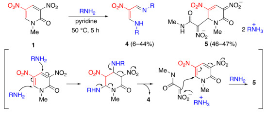 Dinitropyridone 1 serves as a suitable substrate for nucleophilic-type ring transformation, which can be confirmed through aminolysis. The ring opening reaction of 1 proceeds upon treatment with amine, leading to nitro-substituted azadienamine 4 and dianionic product 5 (Scheme 4) [16]. The latter is formed by the addition of anionic nitroacetamide to pyridone 1. This reaction is initiated by the addition of amines at the 4- and 6-positions. The subsequent cleavage of two C–C bonds furnishes azadienamine 4, which indicates that anionic nitroacetamide serves as a good leaving group. However, it also serves as a nucleophile to form adduct 5 (Scheme 4).