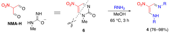 Azadienamine 4 can be used as an excellent ligand to form diverse metal complexes [17,18,19]. From the perspective of ligand preparation, this reaction is not suitable, as dinitropyridone 1 is consumed by eliminated nitroacetamide. This problem is overcome by using 1-methyl-5-nitro-2-pyrimidinone (6) instead of dinitropyridone 1, as the eliminated urea is less nucleophilic than nitroacetamide and can thus avoid the consumption of 6 (Scheme 5) [20].