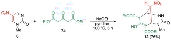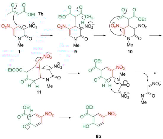 A plausible mechanism for this reaction is illustrated in Scheme 6. The enolate ion 7b attacks the 4-position of pyridone 1 to afford adduct intermediate 9, and the regenerated enolate 10 attacks the 6-position of 1, leading to bicyclic intermediate 11, from which the stable anionic nitroacetamide is eliminated to furnish nitrophenol 8b; the bicyclic intermediate 11 can be isolated from the reaction mixture [21]. In addition, the reaction of nitropyrimidinone 6 and diethyl acetonedicarboxylate 7a also affords bicyclic product 12 in high yield because unstable anionic urea cannot eliminate [23] (Scheme 7). Based on these results, the ring transformation is considered to proceed via bicyclic intermediates.
