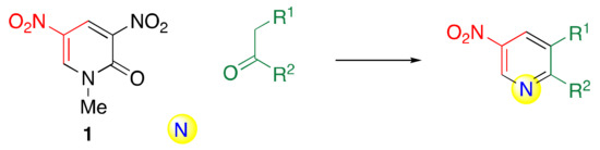 When dinitropyridone 1 is subjected to a reaction with cycloalkanones 13 in the presence of ammonia, nucleophilic-type TCRT efficiently proceeds to afford nitrated cycloalka[b]pyridines 14. In this reaction, pyridone 1 serves as a synthetic equivalent of unstable NMA-H. However, this method is applicable only to cycloalkanones 13, as the competitive ammonolysis of 1 cannot be ignored in cases of other types of ketones.