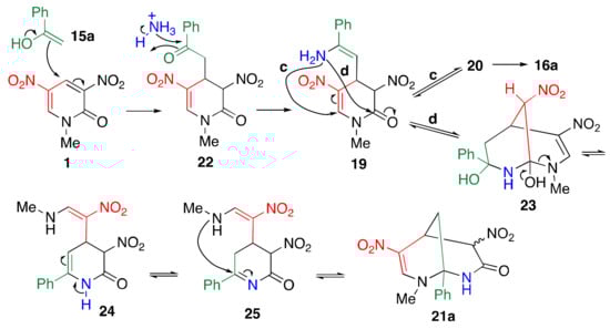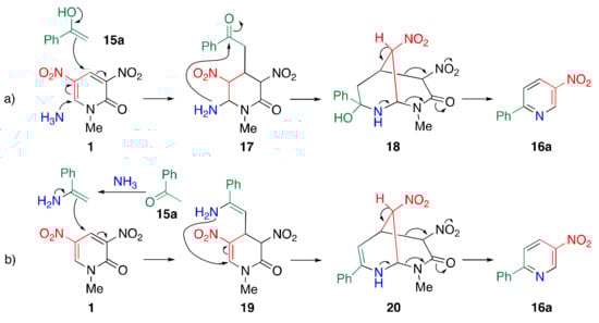 Two plausible mechanisms of TCRT are illustrated in Scheme 9. As mentioned in Section 2.1, both the 4- and 6-positions of dinitropyridone 1 are highly electrophilic, and are thus attacked by the enol form of 15a and ammonia to form adduct intermediate 17 (path a) [24]. The same product, 16a, is obtained when the ammonia and enol switch positions to attack. The amino group intramolecularly attacks the carbonyl group derived from 15a, leading to bicyclic intermediate 18, from which nitroacetamide is eliminated and accompanied by aromatization to afford nitropyridine 16a. Another possibility is that ketones are converted to enamines, which might serve as an actual nucleophile (path b) [50]. After adding the enamine to pyridone 1, the amino group intramolecularly attacks the 6-position to form bicyclic intermediate 20, and elimination of nitroacetamide leads to the formation of nitropyridine 16a.