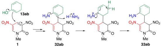 Dinitropyridone 1 undergoes TCRT with cycloalkanone 13 in the presence of ammonium acetate, leading to cycloalka[b]pyridines 14 (Table 8) [55]. Cycloalkanones 13 with various ring sizes efficiently react under conventional heating (Condition C) to afford the corresponding nitropyridines condensed with five-, six-, seven-, and eight-membered rings. The reaction time is considerably shortened by using microwave heating (Condition D). In this reaction, the unsymmetrical ketone, 2-methylcyclohexanone 13aa, which reacts at the 6-position not at the 2-position, as aromatization is prevented by a methyl group in the latter case, can also be used as a reagent. When 2-cyclohexenone 13ab is used, migration of the double bond is observed, which may occur after the addition of ketone 13ab to pyridone 1 and the subsequent conversion to dienamine 32ab, leading to the formation of dienamine 33ab (Scheme 11).