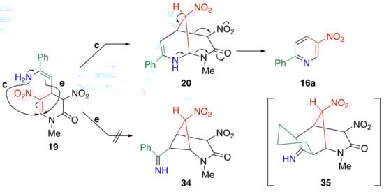 As shown in Scheme 10, the TCRT is initiated by the addition of the enol form of a ketone to the 4-position of dinitropyridone 1, after which the acyl group of adduct 19 is converted to enamine 20 by the ammonium ion. Enamine has an ambident property, where β-carbon is generally more nucleophilic than the amino group. In the case of adduct intermediate 19 derived from aromatic ketone 15, N-attack (path c) forms a six-membered ring to afford bicyclic intermediate 20, from which nitropyridine 16 is obtained, accompanied by the elimination of nitroacetamide (Scheme 12). In contrast, if a C-attack (path e) occurs, sterically strained four-membered ring 34 is formed. Hence, nitropyridine 16 is formed as the sole product in this TCRT. In cases of α,β-unsaturated ketones 26 and 28 and aldehydes 30, a similar reactivity is observed, as these carbonyl compounds have only one kind of α-hydrogen.