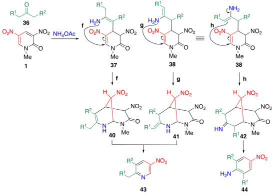 When dinitropyridone 1 is subjected to a reaction with aliphatic ketones 36 in the presence of ammonium acetate, two types of TCRT occur to afford nitropyridines 43 and nitroanilines 44 (Table 9) [56]. Generally, 2,6-disubstituted 4-nitroanilines 44 are prepared from the corresponding anilines by nitration under harsh reaction conditions, wherein protection and deprotection of the amino groups are necessary [57]. Furthermore, the preparation of this compound suffers from the limitation of Friedel–Crafts alkylation. There are several limitations for the Friedel–Crafts alkylation, such as the following: (1) The monoalkylated product undergoes further alkylation, (2) it is difficult to introduce two different alkyl groups, (3) primary alkyl groups longer than the ethyl group cannot be introduced, (4) a phenyl group cannot be introduced, and (5) nitrobenzene and aniline do not facilitate the alkylation. The TCRT overcomes these disadvantages.