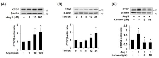 To determine whether Ang II induces CTGF expression in VSMCs, the cells were treated with various concentrations of Ang II (1, 10, and 100 nM) for 24 h. Separately, cells were treated with 100 nM Ang II for various times (0, 4, 8, 12, and 24 h). Ang II treatment increased CTGF protein expression in dose- and time-dependent manners (Figure 1A,B). Next, to investigate whether kahweol suppresses CTGF expression in VSMCs, various doses of kahweol were treated to Ang II-stimulated VSMCs. Kahweol reduced CTGF expression by half relative to the Ang II treatment group (Figure 1C). To investigate whether kahweol affects cell viability, kahweol (5 and 10 μM) was treated in VSMCs. In MTT assay, cell viability was not significantly affected at 5 and 10 μM of kahweol (data not shown). These results indicate that kahweol suppresses Ang II-induced CTGF expression in VSMCs.
