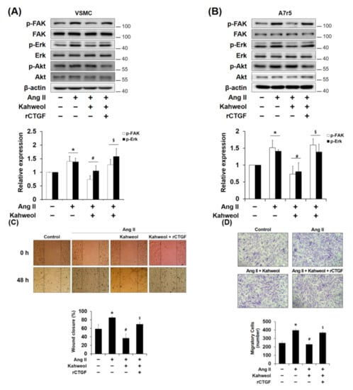 To investigate the underlying mechanisms that contribute to the regulation of CTGF by kahweol, the levels of phosphorylated Erk, FAK, and protein kinase B (Akt), which have been reported to mediate VSMC migration and proliferation [9], were observed in primary cultured VSMCs (rat origin cells) and A7r5 (rat origin cell line). Kahweol inhibited Ang II-induced FAK and Erk phosphorylation, but there was no significant effect on Akt phosphorylation. The decreases in FAK and Erk phosphorylations were restored by rCTGF administration (Figure 3A,B). Next, the kahweol effect on migration in Ang II-stimulated VSMCs was evaluated to assess wound healing effects. Ang II-stimulated VSMCs showed approximately wound healing over 85% of the scratched area compared to that of the untreated control, which showed wound healing over 58% of the scratched area. Kahweol treatment inhibited the wound healing to 36% of the scratched area while rCTGF administration restored it to 70% (Figure 3C). Furthermore, an inhibitory effect of kahweol on VSMC migration was also observed in the additionally performed transwell analysis. Ang II increased migration by 1.6-fold relative to the untreated control. Migration was reduced to the control level by kahweol treatment, and rCTGF administration significantly reversed migration, increasing it by 1.5-fold (Figure 3D). Taken together, these results indicate that kahweol inhibits Ang II-induced FAK and Erk phosphorylation and cell migration.