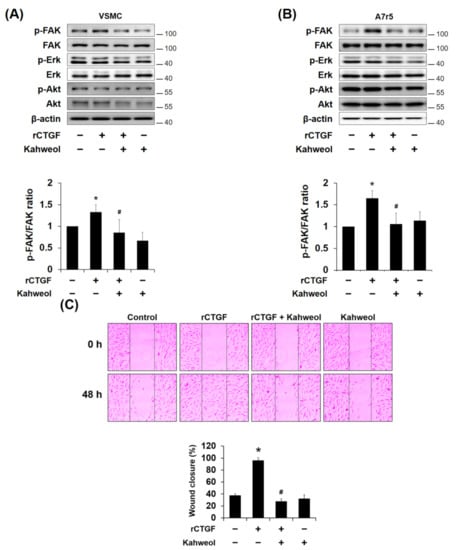 The involvement of FAK in the mechanism underlying the kahweol effect on migration in CTGF-stimulated VSMCs. (A,B) Cells were pretreated with rCTGF (50 ng/mL) for one hour and then treated with kahweol (10 μM) for 24 h. Soluble lysates were subjected to Western blotting for FAK, Erk, and Akt. Protein levels of phosphorylated FAK, Erk, Akt, and β-actin were determined by Western blotting with specific antibodies. Bar graphs present the densitometric quantification of the Western blot bands. (C) Cells were scratched with a micropipette tip to form a cell-free (wounded) area and pretreated with rCTGF (50 ng/mL) for one hour and then treated with kahweol (10 μM) for for 48 h. Wound areas were visualized using a phase-contrast microscope. The distance migrated was determined as the average of the distances of each cell from the wound boundary. Results are representative of three independent experiments. *, p < 0.05 vs. untreated control; #, p < 0.05 vs. rCTGF group.