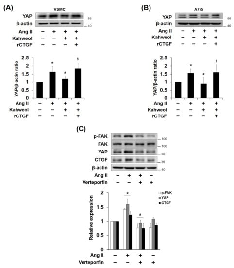 Yes-associated protein (YAP) is known as a transcriptional regulator of the CTGF gene, and it has been reported that FAK controls durotaxis by hepatic stellate cells through YAP activation [30]. Thus, whether kahweol regulates Ang II-induced YAP expression was investigated. The result showed that Ang II increased YAP expression, and kahweol suppressed it, which was reversed by rCTGF administration (Figure 6A,B). Moreover, to demonstrate whether YAP contributes to CTGF and other protein expression in Ang II-stimulated VSMCs, YAP activity was inhibited by verteporfin, known as a YAP inhibitor. Ang II-induced FAK phosphorylation, YAP, and CTGF expression were significantly suppressed by verteporfin (Figure 6C). These data suggest that kahweol inhibits Ang II-induced YAP expression, and the YAP acts as a transcriptional regulator of Ang II-induced CTGF in VSMCs.