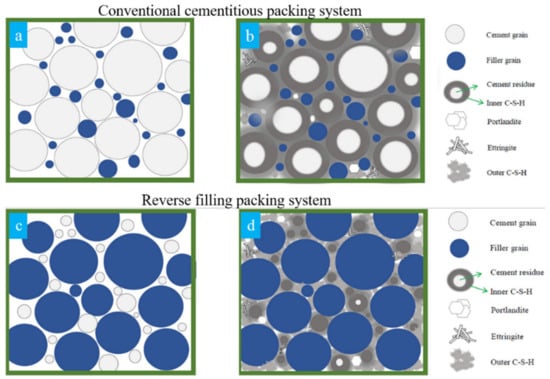 To comprehensively understand the conception of the reverse filling system, a comparison between the conventional cementitious materials and the reverse filling system with respect to the packing system is presented. As demonstrated schematically in Figure 1a,b, large amounts of fine particles, especially silica fume, are commonly used to fill the space between the grain structure consists of Portland cement particles in the conventional packing system of UHPC, UHPFRC, or RPC. For instance, the content of cement and silica fume in UHPC is around 1100–1300 kg/m3 and 20–26 wt % in typical UHPFRC [14,15,16]. However, the limited available space suppressed the continuous hydration, resulting in a lowered hydration degree as well as the use of efficiency [17]. In comparison, in the reverse filling system, as shown in Figure 1c,d, instead of using cement as coarse particles to construct the skeleton of the packing system, the initial packing framework is built up by using inert coarse particles such as limestone and quartz. Superfine cement particles are then added to fill the space and bind these coarser particles during the hydration process. The substitution of Portland cement by inert filler in the main grain structure contributes to a larger reduction of cement content. In addition, the use of superfine cement could result in an enhanced hydration rate and degree due to the reduced size effect [18,19].