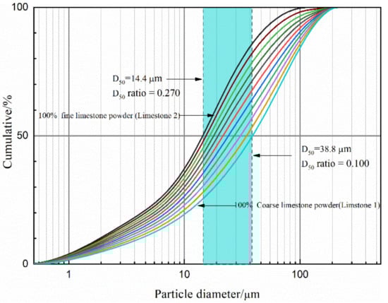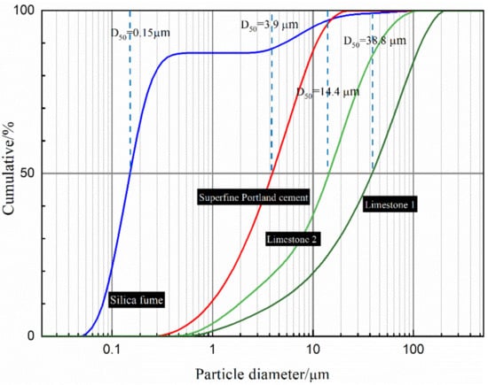In this study, D50, the diameter below which the cumulative portion accounts for 50%, is used to present the mean size of limestone filler or superfine cement, and the D50 ratio is referred to as the ratio between fine and large particles hereinafter in this study.