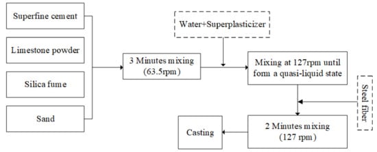 A forced mixer with a rotating blade was employed to prepare samples. The detailed procedure is illustrated in Figure 3. First, the raw materials were added and mixed at dry-state with a slow rotating rate of 63.5 rpm for 3 min to improve the uniformity. Then water and superplasticizer were gradually added, and the spinning rate was turned up to 127 rpm to the powder turns into a quasi-liquid state, then the obtained mixture was mixed at 63.5 rpm for another 2 min. In the case of steel fiber incorporation, steel fiber was added into the homogeneous mixture at the mixing rate of 63.5 rpm.