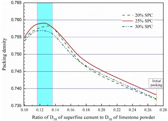 As shown in Figure 5, for the binary system with different content of superfine Portland cement (D50 = 3.9 μm), the estimated packing density calculated from the CPM model reaches the maximum value when the ratio of D50 locates between 0.116 and 0.136. This demonstrates that the increase of the D50 size of limestone powder can improve the packing density of the binary reverse filling system.