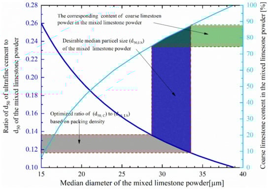 Figure 6 presents the correlation between the size ratio, D50 value, and the content of coarse limestone powder (limestone 1). To obtain the desired size ratio (0.116–0.136), which corresponds to the highest packing density, the D50 of mixed limestone powder and content of limestone 1 should locate between 28.7 and 33.6 μm and 74−88%. Therefore, in this study, the content of limestone 1 was chosen to be 80%. Correspondingly, the D50 and size ratio is 30.4 μm and 0.128, respectively.