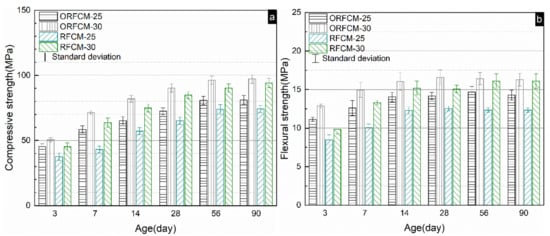 The compressive and flexural strength for optimized reverse filling cementitious materials from 3 days to 90 days are presented in Figure 7a,b). As shown, both the compressive and flexural strength increased with the content of superfine Portland cement. Sample ORFCM-30 exhibited both the highest compressive and flexural strength regardless of age. This is ascribed to the reduced water to cement (w/c) ratio. Although the water to powder (w/p) ratio for optimized reverse filling materials is fixed at 0.12, the actual w/c ratio for ORFCM-25 and ORFCM-30 is 0.48, and 0.4, respectively. According to research conducted by Powers [31], the minimum required w/c ratio for fully hydrated Portland cement is around 0.38. Theoretically, a w/c ratio higher than 0.38 would give rise to more voids, which coarse the microstructure and weaken the mechanical property. It is obvious that the non-optimized samples also exhibit a similar strength development, i.e., gradually increased to its maximum value at around 56d and stabilized afterward. It should be noted that the compressive strength of all the samples at 1d was not presented because of the retarding effect brought by the addition of large amounts of superplasticizer. The comparison of mechanical property between the optimized and non-optimized group are shown in Figure 7. For sample ORFCM-25, the compressive and flexural strength reached 81.5 MPa and 14.8 MPa at 90 d, which is around 10% higher than that of RFCM-25. As for sample ORFCM-30 and RFCM-30, the gap between their mechanical property gradually diminished with the increasing curing time. At the age of 90 d, both the compressive and flexural strength increased to about the same level.