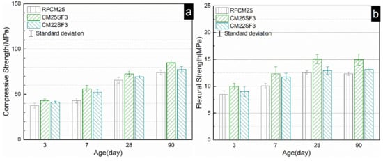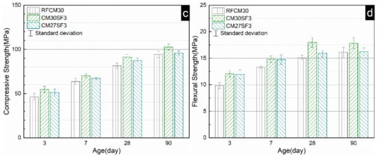 The mechanical property of the reverse filling system blended with silica fume and steel fiber is shown in Figure 8. As can be seen, regardless of the cement content, the incorporation of 3% silica fume generally enhanced the mechanical property to a different extent compared to RFCM25 and RFCM30. The enhancement in mechanical property is more significant for RFCM25. For instance, the compressive and flexural strength of RFCM25 was increased by ~13% and ~25% at the age of 90d, respectively. The very low particle size of silica fume (D50 = 0.15 μm) allows it to fill the voids in the matrix, further increasing the packing density. What is more, the intrinsic amorphous SiO2 content in silica fume can consume portlandite to form extra C–S–H gel to densify the microstructure. It is clear that the substitution of limestone powder by silica fume in both the RFCM25 and RFCM30 systems produced a more remarkable enhancement in the mechanical property than that in substitution of superfine Portland cement. The compressive of CM25SF3 and CM30SF3 was improved by around 13% and 8.5% compared to RFCM25 and RFCM30 at 90 d, reaching 84.7 MPa and 102.6 MPa. Correspondingly, their flexural strength was also elevated by around 20% and 18.6%, attaining 15.2 MPa and 17.8 MPa at 90 d, respectively.