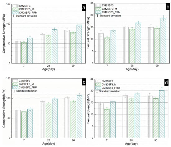 Since the CM25SF3 and CM30SF3 displayed a better mechanical property, their mechanical property of mortar and fiber-reinforced mortar were further investigated and compared. As shown in Figure 9, the addition of steel fiber noticeably improved both the compressive and flexural strength. The compressive strength of CM30SF3_FRM and CM25SF3_FRM ascended to 108.3 MPa and 97.4 MPa while the flexural strength raised to 20.2 MPa and 18.7 MPa, respectively.