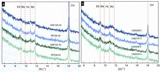 Figure 10 shows the amplified regional XRD patterns of all the binary and ternary reverse filling system at 90 d. As shown, obvious peaks of mono and/or hemi-carbonate were observed instead of monosulfate. This is due to the presence of calcite from limestone powder, which reacts with the Al-bearing phase or substitutes the SO42− by CO32− in monosulfate. The incorporation of silica fume significantly reduced the content of portlandite mirrored by the lowered intensity of CH peak. Compared to the non-optimized binary reverse filling system, the intensity of the monocarbonate peak is lower. This is because of the enlarged size of limestone powder, which affects its reactivity with Al-bearing phases and reaction rate of hydration [32]. In a reverse filling system blended with silica fume, monocarbonate was not detected, which indicates the addition of silica fume affected the reaction between calcite and Al-bearing phase.