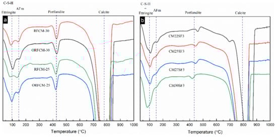 The DTG curves of all the paste samples are shown in Figure 11. Generally, four peaks corresponding to C–S–H and ettringite, AFm, portlandite, and calcite can be observed in all curves. It is remarkable that the peak of portlandite, which locates between 400 to 450 °C in a reverse filling system blended with silica fume, was much lower than that in the binary reverse filling system. This is also consistent with the trend implied by XRD patterns (Figure 10). Moreover, the peak of C–S–H and ettringite in reverse filling system incorporated with silica fume is more pronounced than that in the rest of other blended systems.
