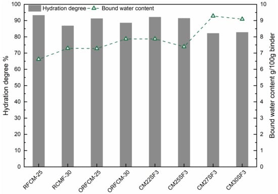 Figure 12 displays the hydration degree of cement and the content of chemical bound water normalized to 100 g binder. As can be seen, despite sample CM27SF3 and CM30SF3, the hydration degree of all the other samples reached around or above 90% at 90 d. The content of chemical bound water seems to be inconsistent with the hydration degree for sample CM27SF3 and CM30SF3. The possible reason for this is due to the addition of silica fume, which leads to a denser packing structure compared to RFCM-30 and ORFCM-30. Consequently, the available space for subsequent hydration in paste samples blended with silica fume is less than that in RFCM-30 and ORFCM-30 [33]. In addition, the silica fume reacts with the portlandite to form secondary C–S–H, contributing to an increase in the content of chemical bound water.