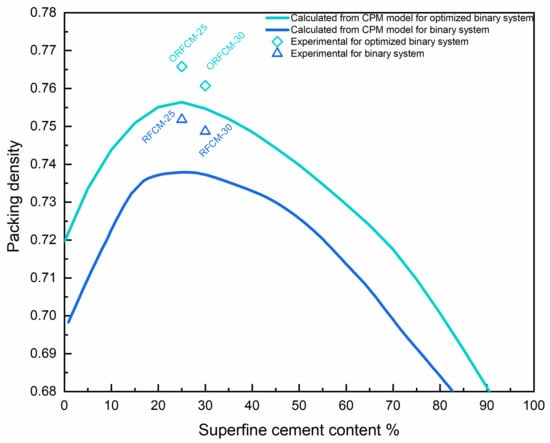 Figure 13 shows the predicted and actual measured packing density for the limestone-superfine cement system and the optimized binary system. As can be seen, both the calculated and measured packing density for optimized binary are higher than those in the non-optimized system. The curve of calculated packing density exhibits a similar trend, i.e., reaching the maximum value when the content of superfine cement is around 20–30%.