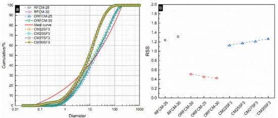 where D is the particle size, Dmax and Dmin are the maximum and minimum particle size, q is the distribution modulus. The value of distribution modulus q has a great influence on the ideal particle distribution curve. It has been reported that when the packing system is dominated by the fine particle, the value of q should be less than 0.25. Based on the work conducted by [7,35], the value of q is fixed at 0.23 in this study. The deviation between the ideal curve and the PSD curve for the blended system is calculated based on the residual sum of squares (RSS) as follows:
