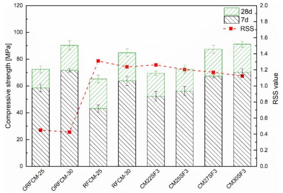 To reveal the effect of packing density on the mechanical property, the value of RSS and packing density calculated from the MAA and CPM model were plotted against the compressive strength at 7 and 28 d. As shown in Figure 15, the packing density indicated by the RSS value demonstrated that the higher content of superfine cement attributes to higher packing density. Correspondingly, samples consist of 30 wt % superfine cement exhibits a higher compressive strength at 7 d. In addition, the optimization of the packing system by adjusting the D50 ratio of mixed limestone powder exerts a remarkable improvement on both early-age compressive strength. The substitution of superfine cement by silica fume produced a less significant improvement on both mechanical property and packing density compared to that by adding 3 wt % silica fume. Moreover, although sample CM25SF3 and CM30SF3 possess a lower packing density, their compressive strength reaches a similar level with the optimized samples, namely ORFCM-25 and ORFCM-30. The possible explanation is due to the pozzolanic reaction of silica fume. Compared to the space-filling ability of silica fume at the initial packing state, the reaction between silica fume and portlandite resulted in secondary C–S–H, thus leading to a refined microstructure. Hence, the addition of silica fume may not manifest into an obvious increase of packing density, but the pozzolanic reaction leads to a densification of microstructure at a late-age.