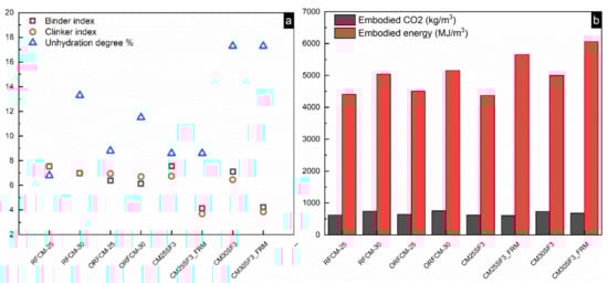 Comparison of environmental impact including unhydration degree, binder, and clinker index (a) and embodied energy and CO2 (b) within reverse filling system.