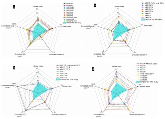 To carry out a comprehensive evaluation of environmental impact, radar graphs which involve all the five ecological indices were plotted in Figure 17. As can be seen in Figure 17a, sample CM25SF3M exhibited better performance than all the other reverse filling systems as it occupies the smallest area among all the samples. Meanwhile, it also possessed a comparable value of both binder index and unreacted cement content in comparison with the optimized samples. Therefore, CM25SF3M was set as the reference sample for the reverse filling system and compared to the typical UHPC from published paper as hydration degree and strength at 28 d were studied [7,10,11,23,36,37]. The comparison in the five aspects between CM25SF3M and UHPC is shown in Figure 17b–d. It is clear that the values of the five indices in CM25SF3M were much lower than that in the majority of UHPC. For instance, compared to UHPC1 from [7] (shown in Figure 17b), there were around 47.8%, 25.3%, 50.4%, 48.7%, and 78.6% reduction corresponded to binder index, clinker index, embodied energy, embodied CO2, and the content of unreacted cement in CM25SF3M. Even compared to the optimized UHPC system [11], as shown in Figure 17c, the CM25SF3M still displayed a comparable performance. There are several reasons for this result. First, even though the superfine cement has higher embodied energy and CO2 compared to that of ordinary Portland cement, the content of ordinary Portland cement still accounts for a higher portion in the mix proportion compared to that in the reverse filling system (reduced to 25%). In addition, the mechanical property of the reverse filling system can reach a comparable level; meanwhile, the embodied energy and CO2 are remarkably reduced, which results in a decreased binder and clinker index. What is more, as presented in Table 3, owning to the reduced cement content, the w/c ratios for the reverse filling system are higher or around the theocratical w/c ratio for full hydration of cement [31]. Moreover, the superfine cement particles which fill into the voids of the packing structure of coarse limestone powder possess more space for hydration compares to that in the UHPC packing structure, where the relatively coarser cement particles are surrounded by finer particles. Hence, the abovementioned reasons attribute to better performance compared to typical UHPC/UHPFRC in the evaluation of environmental impact.