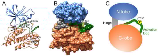 Structure of the kinase domain. (A) Ribbon representation of the kinase domain of ABL (Protein Data Bank (PDB) ID: 2V7A). Blue and orange regions indicate the N- and C-lobes, respectively. Gray and green loops represent the hinge region and activation loop, respectively. The tyrosine residue at position 393 in the activation loop is phosphorylated as indicated. The conserved amino acid residues (DFG and APE motifs) in and around the activation loop are also indicated. (B) Molecular surface image of the ABL domain (PDB ID: 2V7A), in which the colors are identical to the regions shown in (A). ATP binds to the cleft between the N- and C-lobes. (C) Graphical representation of the kinase domain.