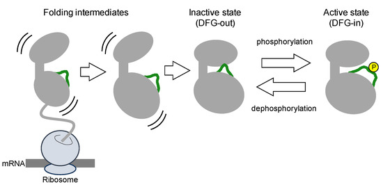 The co-translational folding process of the kinase domain and subsequent activation by phosphorylation (yellow) of the activation loop (green). The nascent polypeptide on the ribosome is folded into its intermediate state. Folding intermediates are unstable and exhibit structural fluctuations in thermodynamic equilibrium. Once the activation loop is phosphorylated, the intermediate state is converted to the active DFG-in state, which returns to the inactive DFG-out state after dephosphorylation by phosphatases.