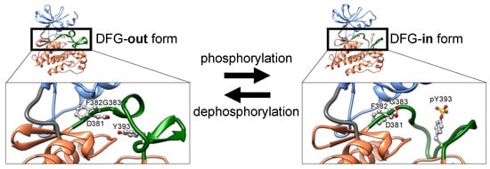Phosphorylation of discrete serine, threonine, or tyrosine residues in the activation loop converts the inactive DFG-out conformation to the active state, denoted as DFG-in (Figure 3) [21]. The negatively charged phosphorylated residues interact with positively charged residues adjacent to or in the activation loop, thereby decreasing loop flexibility. The structural stabilization of the loop opens the ATP-binding pocket by repositioning and fixing the DFG motif inside the cleft (DFG-in), thus maintaining a catalytically competent state [26]. In the active state (Figure 3), the Asp of the DFG motif binds to a magnesium ion that interacts directly with the phosphate in ATP.