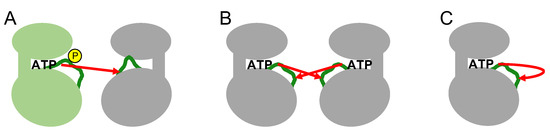 Several kinases phosphorylate their own activation loops intramolecularly (also termed cis-autophosphorylation) (Figure 4) [26]. Intramolecular autophosphorylation is often observed in constitutively active kinases [30]; however, the mechanism behind this type of autophosphorylation of the activation loop remains elusive [16,26]. The fundamental question is how the inactive conformation catches ATP and transfers the phosphate group to the specific residue in its own activation loop. Paradoxically, the inactive state of the kinase catalyzes intramolecular autophosphorylation, indicating a unique intramolecular autophosphorylation-prone state that is structurally distinct from the active conformation. Although it has not been completely elucidated, the autophosphorylation-prone conformation in the inactive state has been explained by the thermodynamic equilibrium between the inactive and active states [26]. The kinase domain structure can fluctuate between the active and inactive states without activation loop phosphorylation [21], although the equilibrium is inclined mostly toward the inactive conformation in the absence of phosphorylation. Once the equilibrium has shifted to a putative autophosphorylation-prone state through environmental or allosteric changes that are not completely known, the kinase cleft spontaneously catches ATP and catalyzes the intramolecular autophosphorylation of its own activation loop.