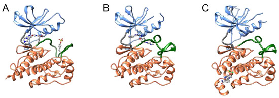 The catalytic domain of protein kinases shares a conserved core consisting of two lobes: the N-lobe, featuring a β-sheet with five strands, and the C-lobe, mostly comprising α-helices and loops (Figure 1). A hinge region connects these lobes, forming an ATP-binding cleft, a highly conserved catalytic scaffold [11,12], between these two lobes. ATP and the substrate bind to the cleft and a nearby recognition site, respectively; the gamma phosphate of ATP is transferred onto a hydroxyl group of the substrate [13,14,15,16]; the resultant ADP is released from the cleft [17,18,19]; and ATP is re-supplied to the cleft to drive the catalytic cycle.